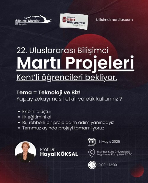 İstanbul Kent Üniversitesi Ortak Dersler Bölümü tarafından düzenlenen “22. Uluslararası Bilişimci Martı Projeleri Kent'li Öğrencileri Bekliyor” konulu etkinlik 13 Mayıs saat: 10:00’da Kağıthane Kampüsü Z0 06 Salonun da gerçekleştirilecektir.