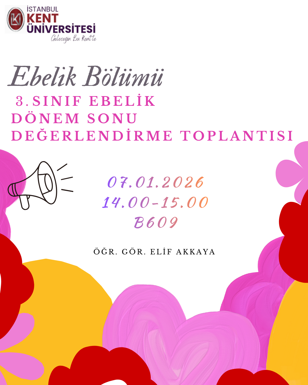 Ebelik Bölümü 3. sınıf öğrencilerinin akademik ve uygulama süreçlerinin değerlendirilmesi amacıyla 07.01.2026 tarihinde saat 14.00-15.00 arasında Dönem Sonu Değerlendirme Toplantısı düzenlenecektir.