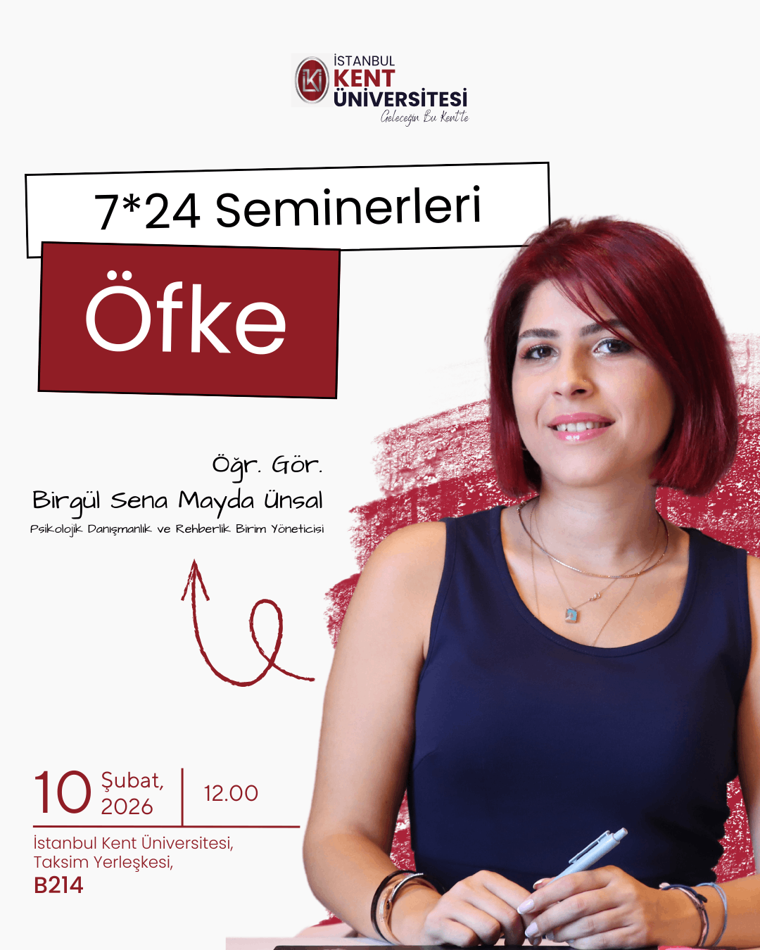 İstanbul Kent Üniversitesi Diş Hekimliği Fakültesi tarafından düzenlenen " 7*24 Seminerleri Öfke " 10 Şubat saat: 12:00'da Taksim Kampüsü B214 nolu derslikte da gerçekleştirilecektir.