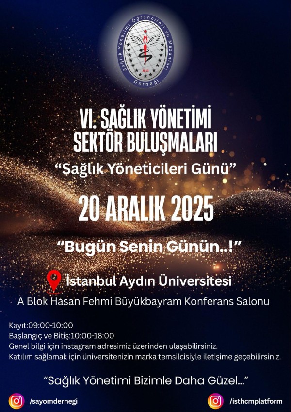 20 Aralık 2025 Cumartesi günü, İstanbul Aydın Üniversitesi’nde SAYOMDER öncülüğünde gerçekleştirilen 6. Sağlık Yönetimi Sektör Buluşmaları’nda emeği geçen SAYOMDER Dernek Başkanı’na, değerli hocalarımıza ve tüm ekibe gönülden teşekkür eder, saygılarımızı sunarız.