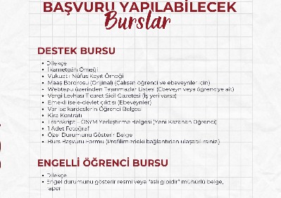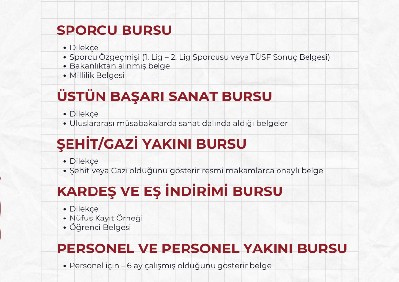 2025-2026 Akademik Yılı Burs Başvuruları 13-24 Ekim 2025 tarihleri arasında kabul edilecektir. Başvuracağınız burs türü için aşağıda yer alan belgeleri eksiksiz bir şekilde Kağıthane Kampüsü’nde yer alan A1-13 numaralı Sağlık, Kültür ve Spor Direktörlüğü ofisine şahsen teslim ederek başvurunuzu gerçekleştirebilirsiniz. Sorularınız için burs@kent.edu.tr adresinden iletişime geçebilirsiniz.