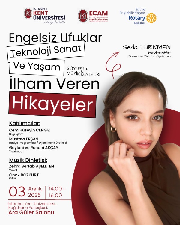İstanbul Kent Üniversitesi Engelli Çalışmaları Uygulama ve Araştırma Merkezi tarafından düzenlenen " Engelsiz Ufuklar Teknoloji Sanat ve Yaşam İlham Veren Hikayeler " konulu etkinlik 3 Aralık saat: 14:00’da Kağıthane Kampüsü Ara Güler Konferans Salonu gerçekleştirilecektir.