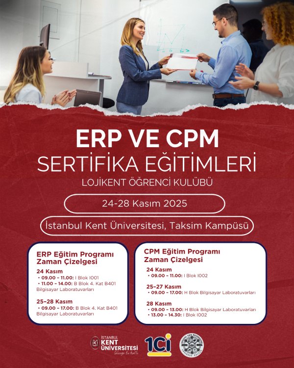 İstanbul Kent Üniversitesi İktisadi, İdari ve Sosyal Bilimler Fakültesi Uluslararası Ticaret ve Lojistik Bölümü, Lojikent Öğrenci Kulübü ve 1Ci firmasının işbirliği ile düzenlenen " ERP ve CPM Sertifika Eğitimleri " konulu etkinlik 24 Kasım saat: 09:00’da Taksim Kampüsü I Blok I001 , I002 ve B Blok 4. Kat B401 nolu derslikte gerçekleştirilecektir.