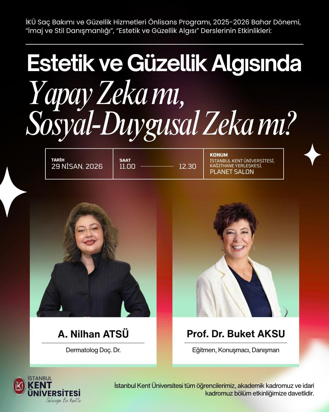 İstanbul Kent Üniversitesi Meslek Yüksekokulu Saç Bakımı ve Güzellik Hizmetleri Programı İmaj ve Stil Danışmanlığı Estetik ve Güzellik Algısı dersleri kapsamında düzenlenen “ Estetik ve Güzellik Algısında Yapay Zeka mı, Sosyal-Duygusal Zeka mı? ” konulu etkinlik 29 Nisan saat: 11:00’da Kağıthane Kampüsü Planet Konferans Salonun da gerçekleştirilecektir.