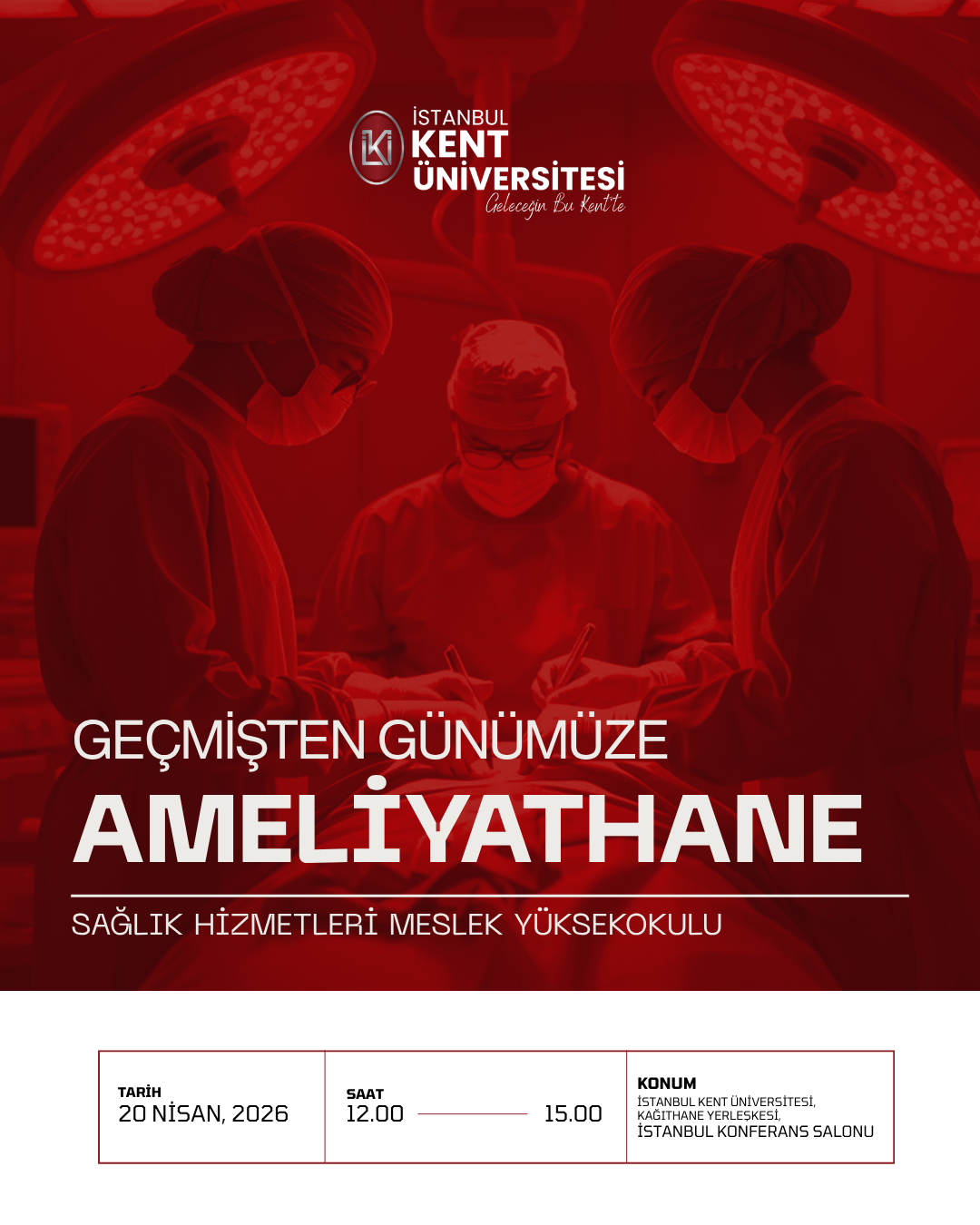 İstanbul Kent Üniversitesi Sağlık Hizmetleri Meslek Yüksekokulu Ameliyathane Hizmetleri Programı tarafından düzenlenen " Geçmişten Günümüze Ameliyathane" konulu etkinlik 20 Nisan saat: 12:00'da Kağıthane Kampüsü İstanbul Konferans Salonun da gerçekleştirilecektir.