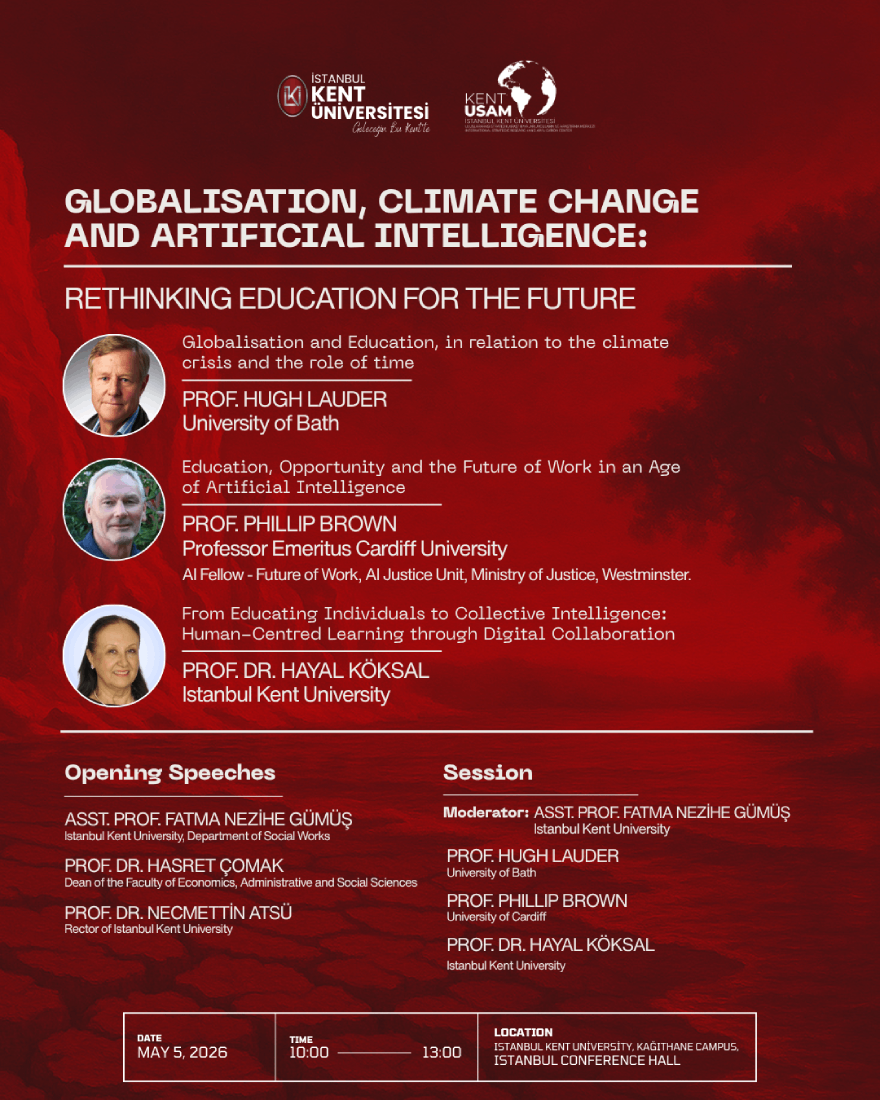 İstanbul Kent Üniversitesi İktisadi, İdari ve Sosyal Bilimler Fakültesi Uluslararası Stratejik Araştırmalar Uygulama ve Araştırma Merkezi KENTUSAM tarafından düzenlenen "Globalisation , Climate Change And Artificial Intelligence: Rethinking Education For The Future" konulu etkinlik 5 Mayıs saat: 10:00'da Kağıthane Kampüsü İstanbul Konferans Salonun da gerçekleştirilecektir.