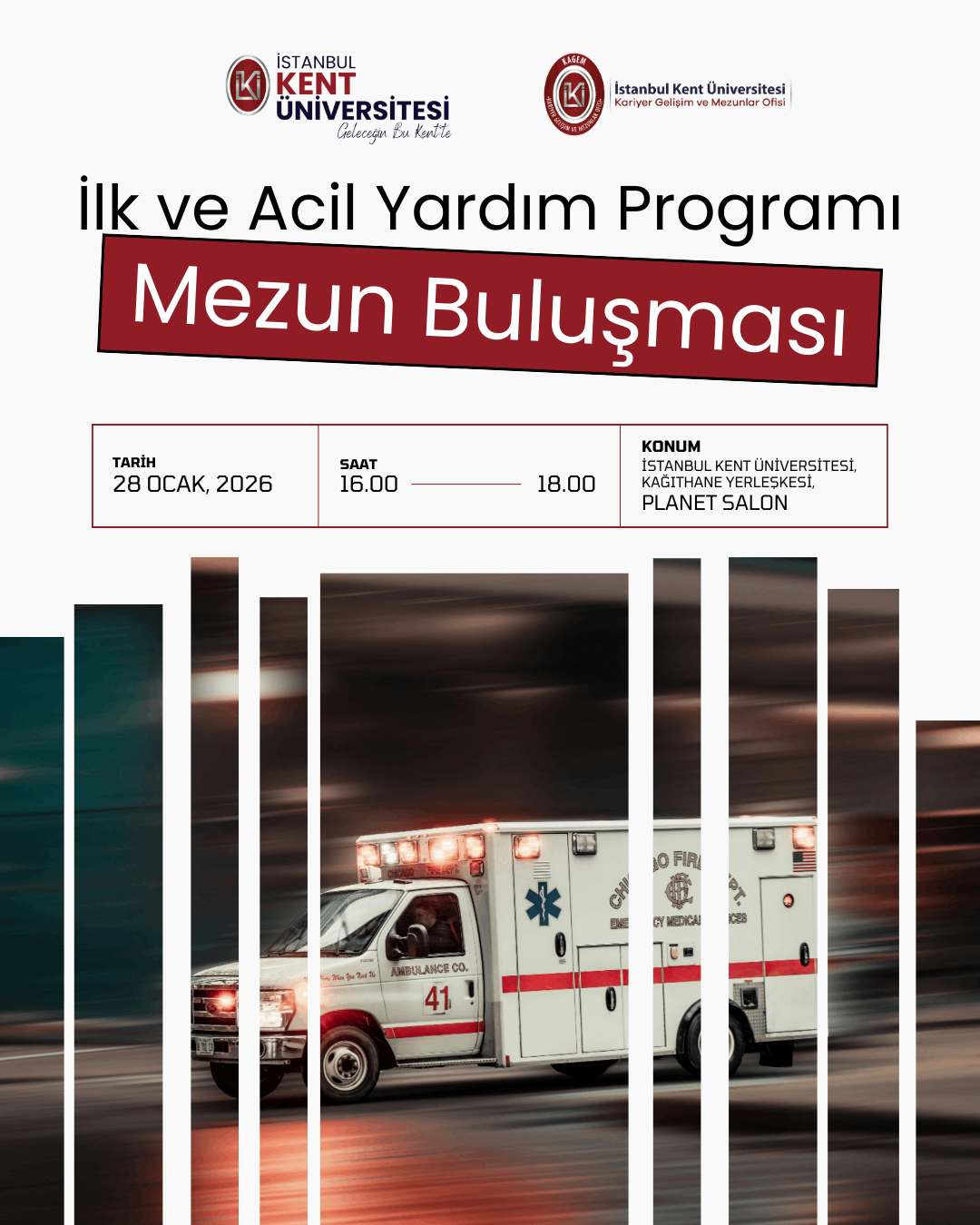 İstanbul Kent Üniversitesi Sağlık Hizmetleri Meslek Yüksekokulu İlk ve Acil Programı tarafından düzenlenen " İlk ve Acil Yardım Programı Mezun Buluşması " 28 Ocak saat: 16:00'da Kağıthane Kampüsü Planet Konferans Salonun da gerçekleştirilecektir.