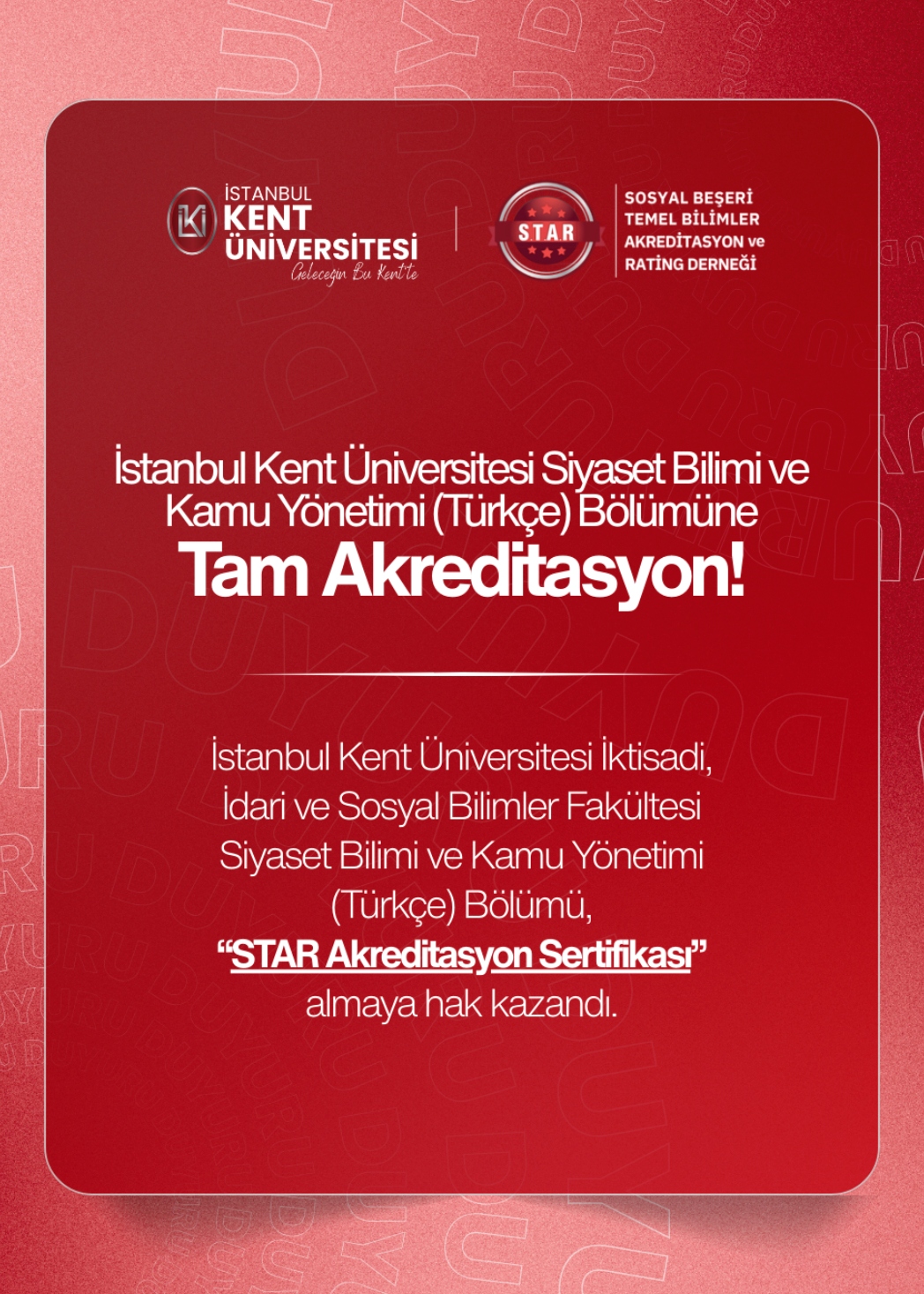 Elde edilen bu önemli başarı, İstanbul Kent Üniversitesi’nin eğitimde kalite güvencesine verdiği önemin ve sürekli gelişim vizyonunun güçlü bir göstergesi olarak öne çıkıyor. Akreditasyon süreci, programın ulusal ve uluslararası standartlara uygunluğunu belgeleyerek öğrencilere sunulan eğitimin niteliğini bir kez daha ortaya koyuyor.
