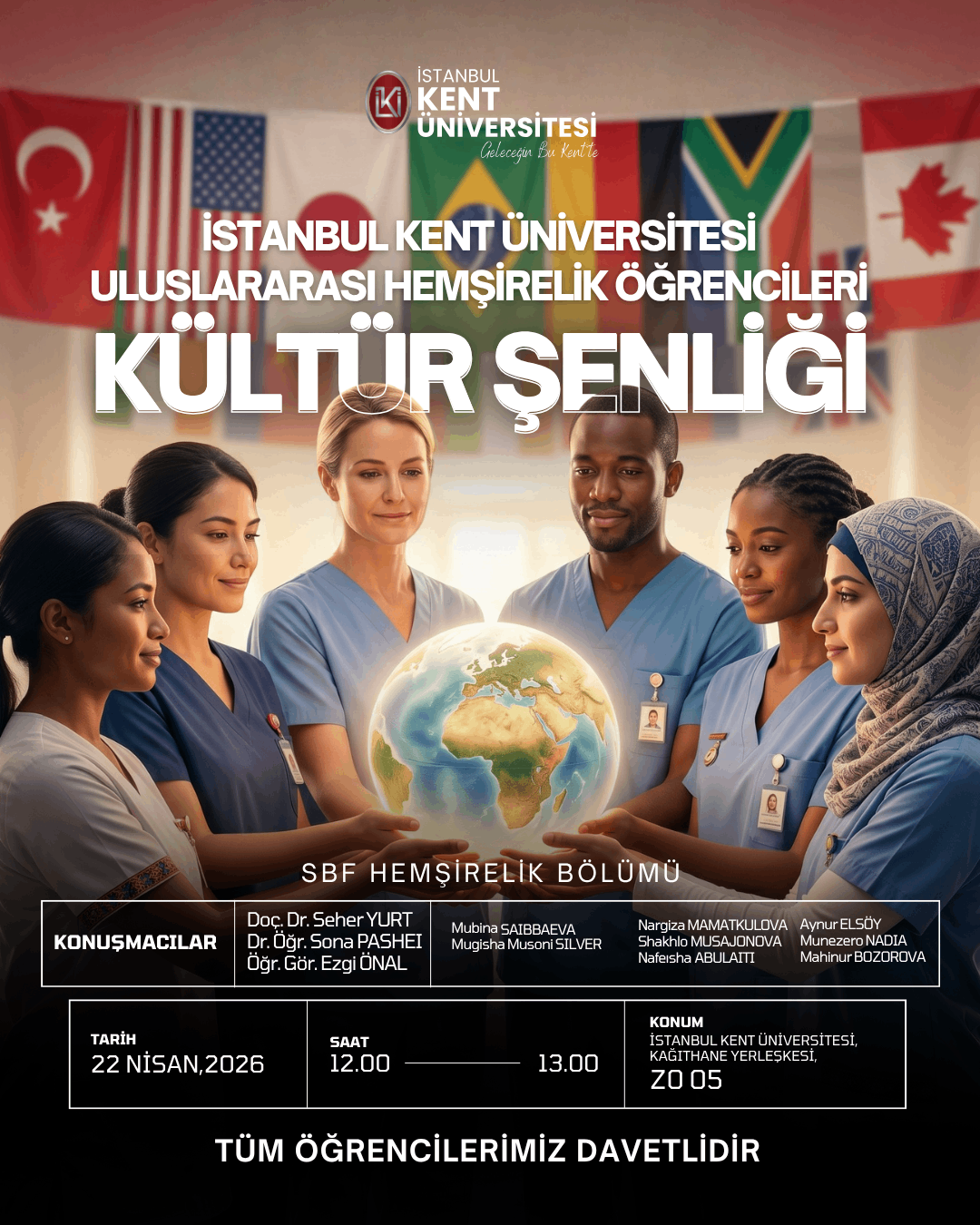 İstanbul Kent Üniversitesi Sağlık Bilimleri Fakültesi Hemşirelik Bölümü tarafından düzenlenen " İstanbul Kent Üniversitesi Uluslararası Hemşirelik Öğrencileri Kültür Şenliği " konulu etkinlik 22 Nisan saat: 12:00'da Kağıthane Kampüsü Z0 05 nolu derslikte derslikte gerçekleştirilecektir.
