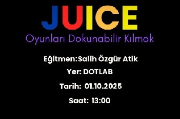İstanbul Kent Üniversitesi Sanat ve Tasarım Fakültesi Dijital Oyun Tasarımı bölümü tarafından düzenlenen " JUICE Oyunları Dokunabilir Kılmak” konulu etkinlik 1 Ekim saat: 13:00’da Kağıthane Kampüsü Dotlab Salonu da gerçekleştirilecektir.
