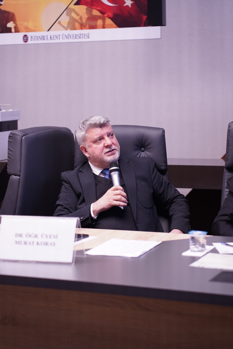 Amerika Birleşik Devletleri ve İsrail’in İran’a Yönelik Müşterek Operasyonu’nun Küresel Enerji Güvenliği ve Ekonomiye Etkileri konusunda Uluslararası Ticaret ve Lojistik Bölüm Başkanı Dr. Öğretim Üyesi Murat KORAY; özellikle 2000’lerin ucuz üretim-ucuz navlun denklemine dayalı lojistik anlayışının artık geçersiz olduğunu vurgulamıştır. Bugünün temel meselesinin maliyet değil, jeopolitik risk ve güvenlik olduğuna değinmiştir. Ton-mil paradoksunu öne çıkararak, 2024’te ticaret hacmi sınırlı artmasına rağmen taşınan mesafenin belirgin biçimde uzadığını, bunun da sistemin verimliliğinin jeopolitik baskılarla eridiğinin en somut göstergesi olduğunu aktardı. Ayrıca Brezilya ve Guyana’nın enerji arzında yeni eksenler oluşturduğunu, Hürmüz gibi kritik boğazlarda yaşanan risklerin ise Suudi Arabistan ve Abu Dabi’nin bypass boru hatlarıyla telafi edilmeye çalışıldığını anlatmıştır. “Savaş kimin işine gelir?” sorusunu ortaya koyarak savunma sanayii, büyük entegre enerji şirketleri, tanker ve sigorta piyasalarının bu ortamdan kazançlı çıktığını, buna karşılık küçük ihracatçıların ve enerji ithalatçılarının kaybeden taraf olduğunu belirtmiştir. Sunumun sonunda da sürekli kriz ortamının küreselleşmeyi zayıflattığını, bloklaşmayı artırdığını ve ölçek ile devlet bağlantısı güçlü aktörleri sistematik biçimde ödüllendiren yapısal bir dönüşüm yarattığına işaret etmiştir.