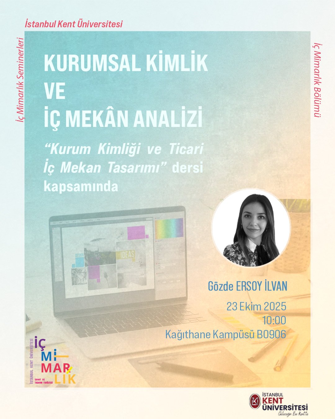 İstanbul Kent Üniversitesi Sanat ve Tasarım Fakültesi İç Mimarlık Bölümü tarafından düzenlenen " Kurumsal Kimlik ve İç Mekan Analizi " konulu etkinlik 23 Ekim saat: 10:00’da Kağıthane Kampüsü B0906 Nolu Salonun da gerçekleştirilecektir.