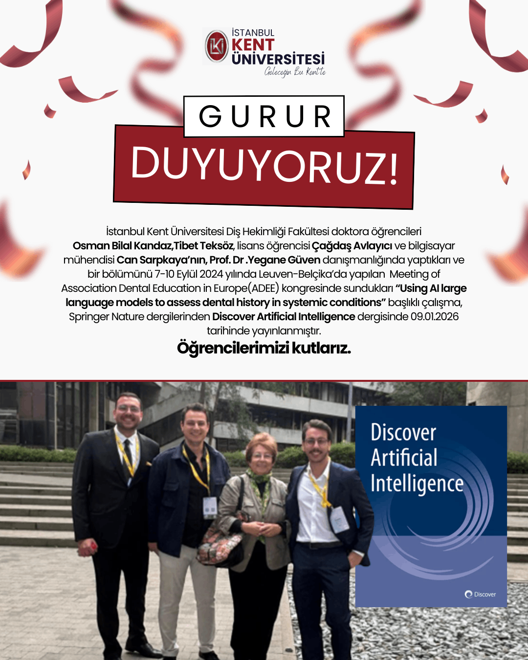 İstanbul Kent Üniversitesi Diş Hekimliği Fakültesi doktora öğrencileri Osman Bilal Kandaz,Tibet Teksöz,lisans öğrencisi Çağdaş Avlayıcı ve bilgisayar mühendisi Can Sarpkaya’nın, Prof.Dr.Yegane Güven danışmanlığında yaptıkları ve bir bölümünü 7-10 Eylül 2024 yılında Leuven-Belçika’da yapılan Meeting of Association Dental Education in Europe(ADEE) kongresinde sundukları “Using AI large language models to assess dental history in systemic conditions” başlıklı çalışma, Springer Nature dergilerinden Discover Artificial Intelligence dergisinde 09.01.2026 tarihinde yayınlanmıştır.Öğrencilerimizi kutlarız.