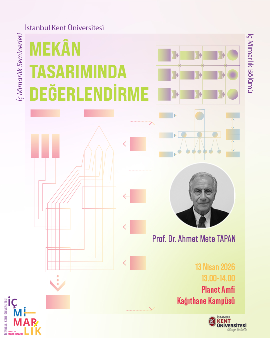 “Mekân Tasarımında Değerlendirme” başlıklı seminer, Prof. Dr. Ahmet Mete TAPAN tarafından 13 Nisan 2026 Pazartesi günü, 13.00-14.00 saatleri arasında Kağıthane Kampüsü Planet Amfi'de gerçekleştirilecektir.