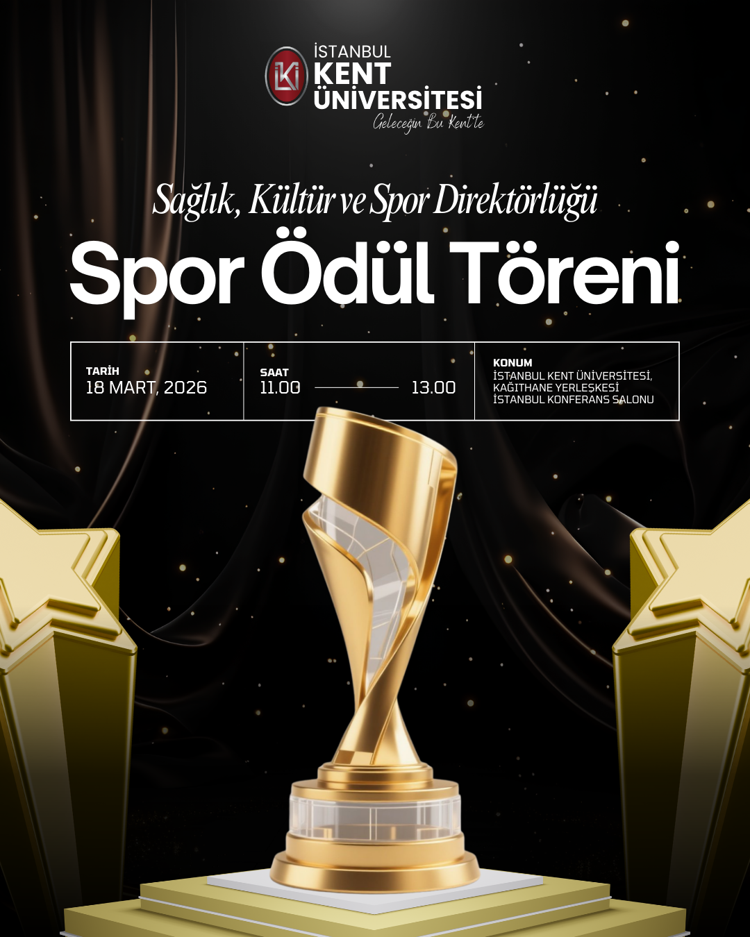 İstanbul Kent Üniversitesi Sağlık, Kültür ve Spor Direktörlüğü tarafından düzenlenen " Sağlık, Kültür ve Spor Direktörlüğü Spor Ödül Töreni " 18 Mart saat: 11:00'da Kağıthane Kampüsü İstanbul Konferans Salonun da gerçekleştirilecektir.