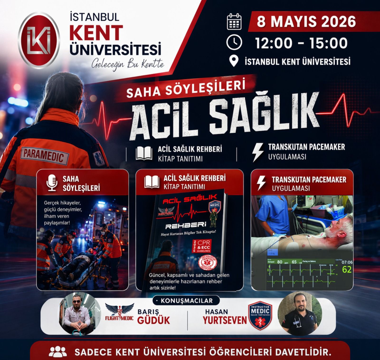 İstanbul Kent Üniversitesi Sağlık Hizmetleri Meslek Yüksekokulu İlk ve Acil Yardım Programı öğrencilerinin mesleki gelişimlerine katkı sağlamak amacıyla planlanan “Saha Söyleşileri: Acil Sağlık” etkinliği, 8 Mayıs 2026 tarihinde gerçekleştirilecektir.
