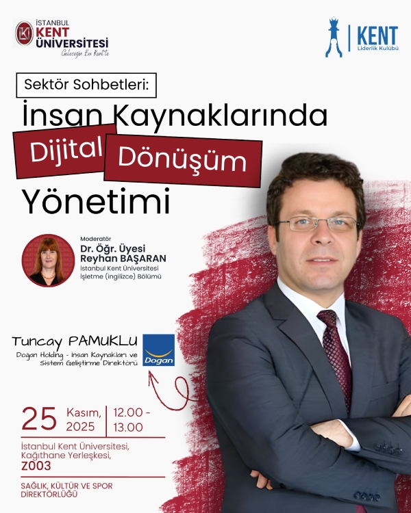 İstanbul Kent Üniversitesi Sağlık, Kültür ve Spor Direktkörlüğü , İktisadi, İdari ve Sosyal Bilimler Fakültesi İşletme Bölümü ve ve İşletme Öğrenci Kulübü - Kent Liderlik tarafından düzenlenen " Sektör Sohbetleri: İnsan Kaynaklarında Dijital Dönüşüm Yönetimi" konulu etkinlik 25 Kasım saat: 12:00’da Kağıthane Kampüsü Z003 nolu derslikte gerçekleştirilecektir.