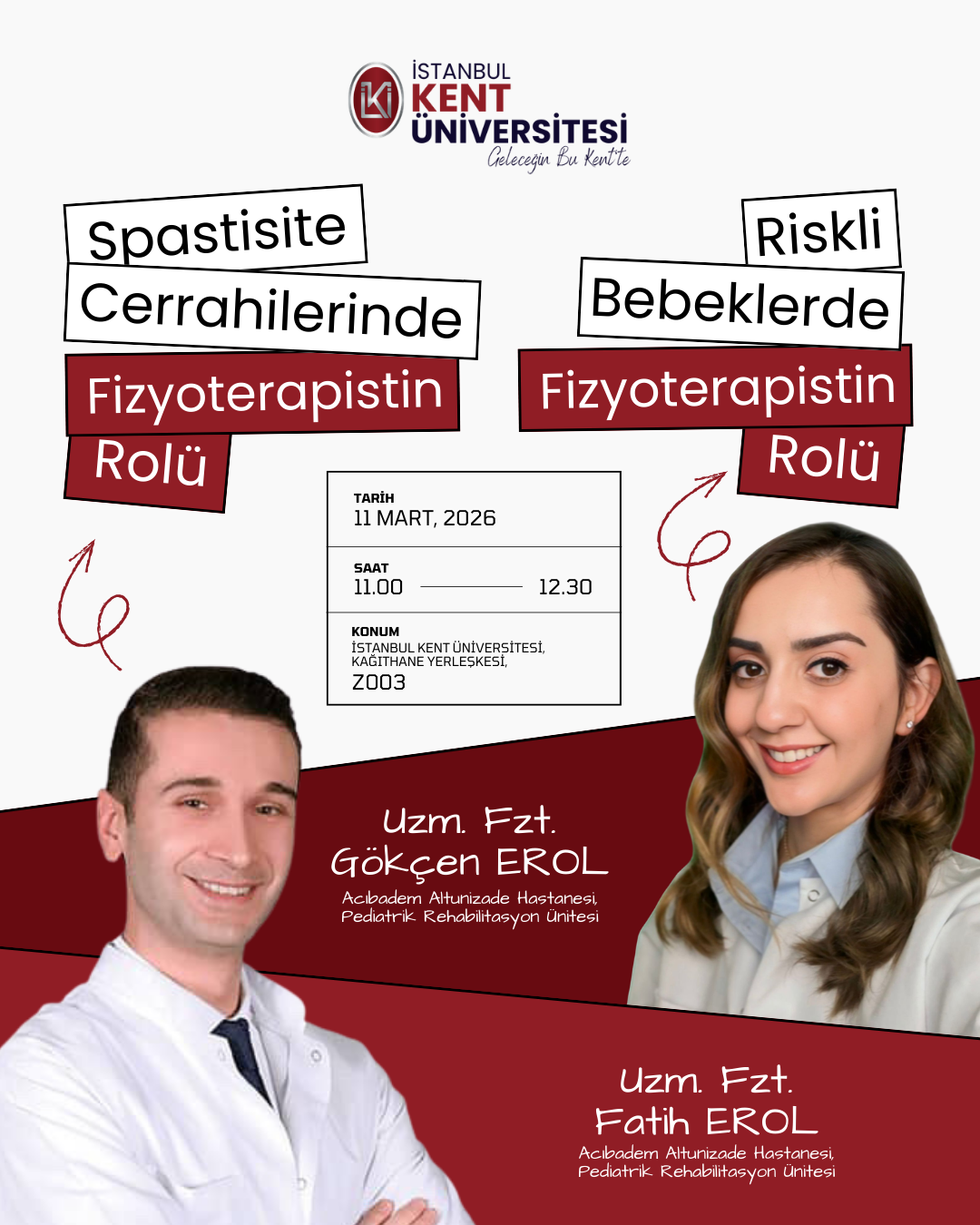 İstanbul Kent Üniversitesi Sağlık Bilimleri Fakültesi Fizyoterapi ve Rehabilitasyon Bölümü tarafından düzenlenen " Spastisite Cerrahilerinde Fizyoterapistin Rolü ve Riskli Bebeklerde Fizyoterapistin Rolü " 11 Mart saat: 11:00'da Kağıthane Kampüsü Z003 nolu Salonun da gerçekleştirilecektir.