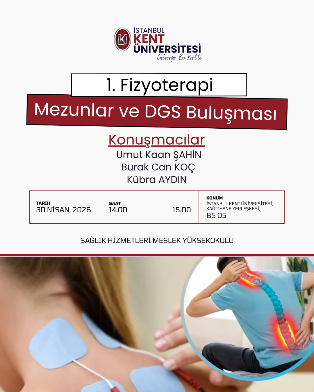 İstanbul Kent Üniversitesi Sağlık Hizmetleri Meslek Yüksekokulu Fizyoterapi Programı tarafından düzenlenen " 1. Fizyoterapi Mezunlar ve DGS Buluşması " konulu etkinlik 30 Nisan saat: 14:00'da Kağıthane Kampüsü B5 05 nolu derslikte gerçekleştirilecektir.