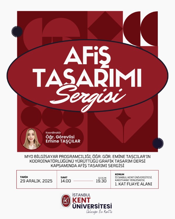 İstanbul Kent Üniversitesi Meslek Yüksekokulu Bilgisayar Programcılığı tarafından düzenlenen " Afiş Tasarımı Sergisi " 29 Aralık saat: 14:00'da Kağıthane Kampüsü 1. kat Fuaye Alanı gerçekleştirilecektir.