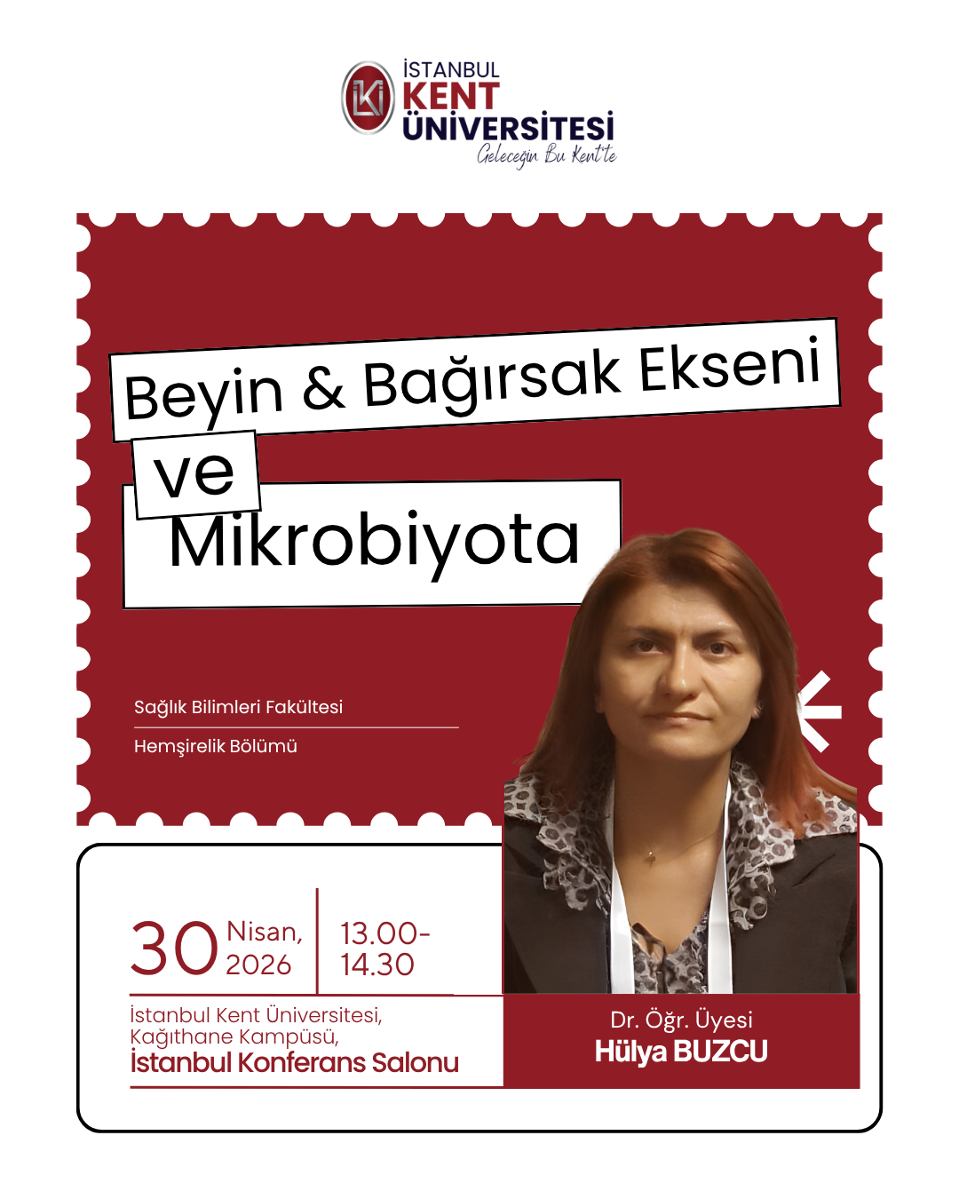İstanbul Kent Üniversitesi Sağlık Bilimleri Fakültesi Hemşirelik Bölümü tarafından düzenlenen " Beyin & Bağırsak Ekseni ve Mikrobiyota " konulu etkinlik 30 Nisan saat: 13:00'da Kağıthane Kampüsü İstanbul Konefrans Salonun da gerçekleştirilecektir.