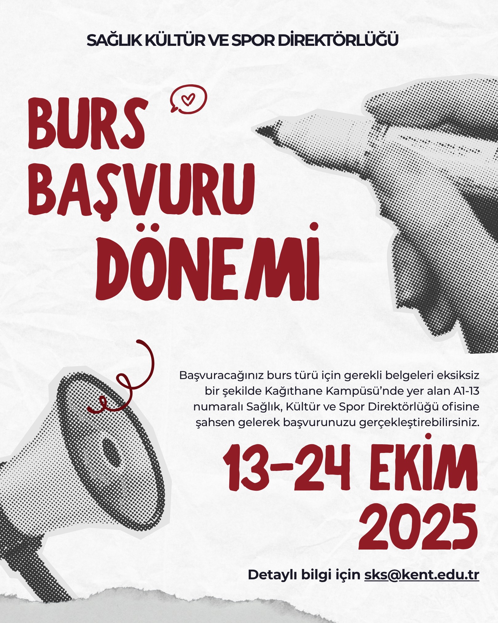2025-2026 Akademik Yılı Burs Başvuruları 13-24 Ekim 2025 tarihleri arasında kabul edilecektir. Başvuracağınız burs türü için aşağıda yer alan belgeleri eksiksiz bir şekilde Kağıthane Kampüsü’nde yer alan A1-13 numaralı Sağlık, Kültür ve Spor Direktörlüğü ofisine şahsen teslim ederek başvurunuzu gerçekleştirebilirsiniz. Sorularınız için burs@kent.edu.tr adresinden iletişime geçebilirsiniz.
