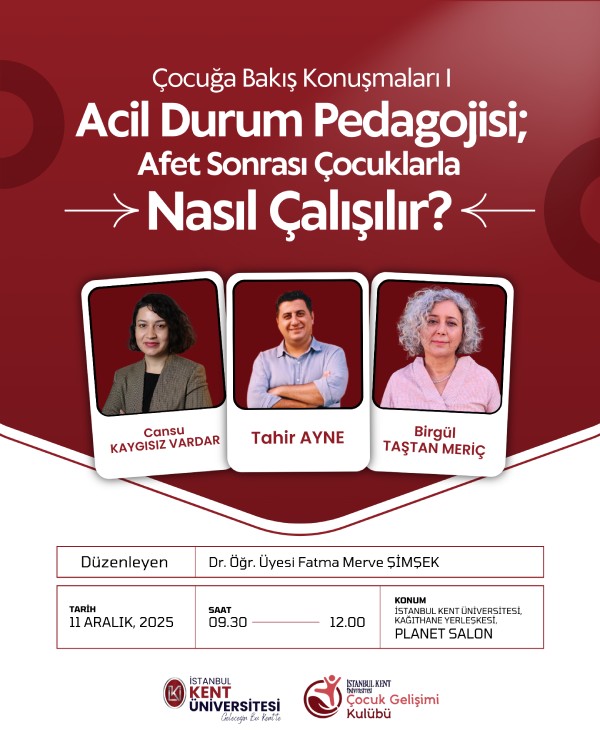 İstanbul Kent Üniversitesi Sağlık Hizmetleri Meslek Yüksekokulu Çocuk Gelişimi Programı ve Çocuk Kulübü tarafından düzenlenen "Çocuğa Bakış Konuşmaları I : Acil Durum Pedagojisi; Afet Sonrası Çocuklarla Nasıl Başa Çıkılır?" 11 Aralık saat: 09:30’da Kağıthane Kampüsü Planet Konferans Salonu gerçekleştirilecektir.