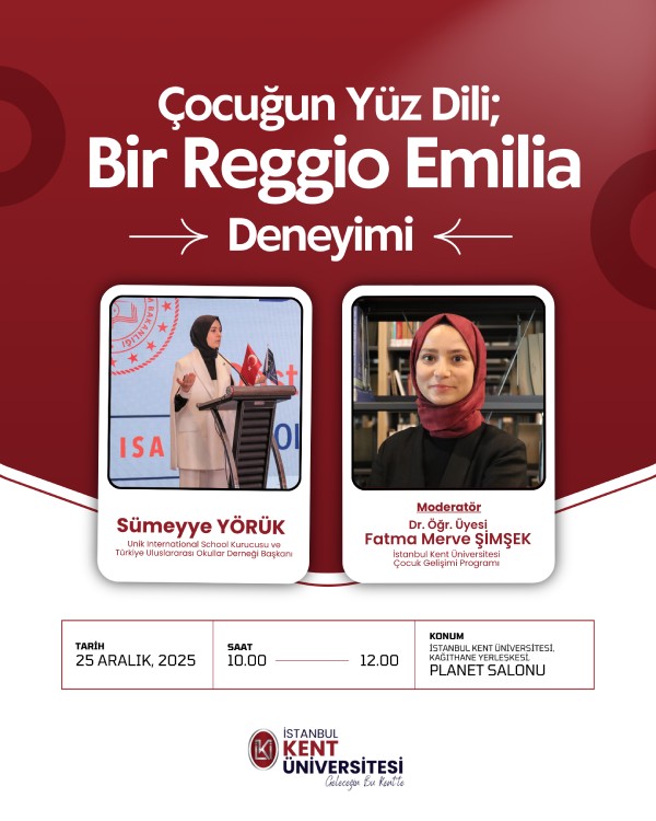 İstanbul Kent Üniversitesi Sağlık Hizmetleri Meslek Yüksekokulu Çocuk Gelişimi Programı tarafından düzenlenen " Çocuğun Yüz Dili; Bir Reggio Emilia Deneyimi " 25 Aralık saat: 10:00'da Kağıthane Kampüsü Planet Konferans Salonun da gerçekleştirilecektir.