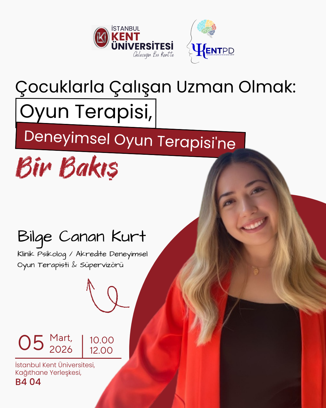 İstanbul Kent Üniversitesi Psikolojik Danışmanlık ve Rehberlik Birimi tarafından düzenlenen " Çocuklarla Çalışan Uzman Olmak: Oyun Terapisi, Deneyimsel Oyun Terapisi'ne Bir Bakış " 5 Mart saat: 10:00'da Kağıthane Kampüsü B4 04 nolu Salonun da gerçekleştirilecektir.
