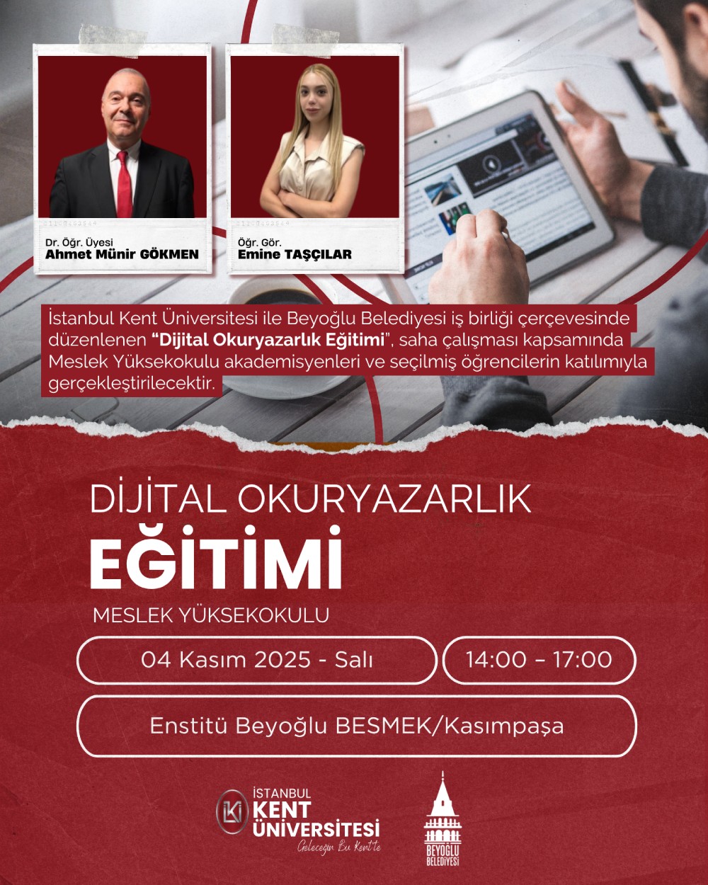 İstanbul Kent Üniversitesi ile Beyoğlu Belediyesi iş birliği çerçevesinde Meslek Yüksekokulu tarafından düzenlenen " Dijital Okuryazarlık Eğitimi " konulu etkinlik 4 Kasım saat: 14:00’da Enstitü Beyoğlu BESMEK / Kasımpaşa' da gerçekleştirilecektir.