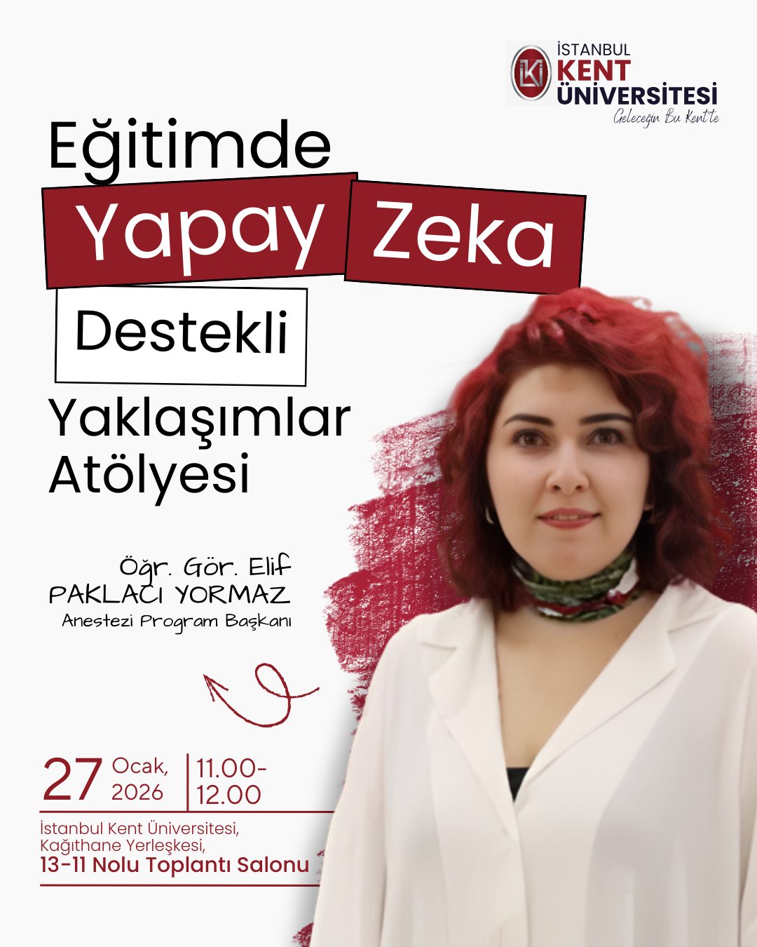 İstanbul Kent Üniversitesi Sağlık Hizmetleri Meslek Yüksekokulu tarafından düzenlenen "Eğitimde Yapay Zeka Destekli Yaklaşımlar Atölyesi " 27 Ocak saat: 11:00'da Kağıthane Kampüsü 13-11 Nolu Toplantı Salonun da gerçekleştirilecektir.