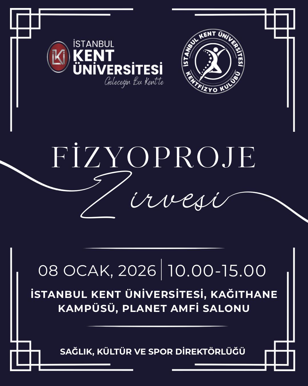 İstanbul Kent Üniversitesi Sağlık Bilimleri Fakültesi Fizyoterapi ve Rehabilitasyon bölümü tarafından düzenlenen " Fizyoproje Zirvesi " 8 Ocak saat: 10:00'da Kağıthane Kampüsü Planet Konferans Salonun da gerçekleştirilecektir.