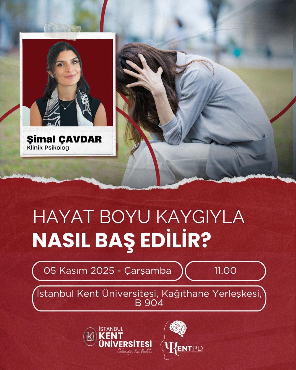 İstanbul Kent Üniversitesi Psikolojik Danışmanlık ve Rehberlik Birimi tarafından düzenlenen ''Hayat Boyu Kaygıyla Nasıl Baş Edilir?'' isimli etkinlik 5 Kasım Çarşamba günü saat 11.00'de Kağıthane Kampüsümüzün B904 numaralı sınıfında gerçekleştirilecektir.