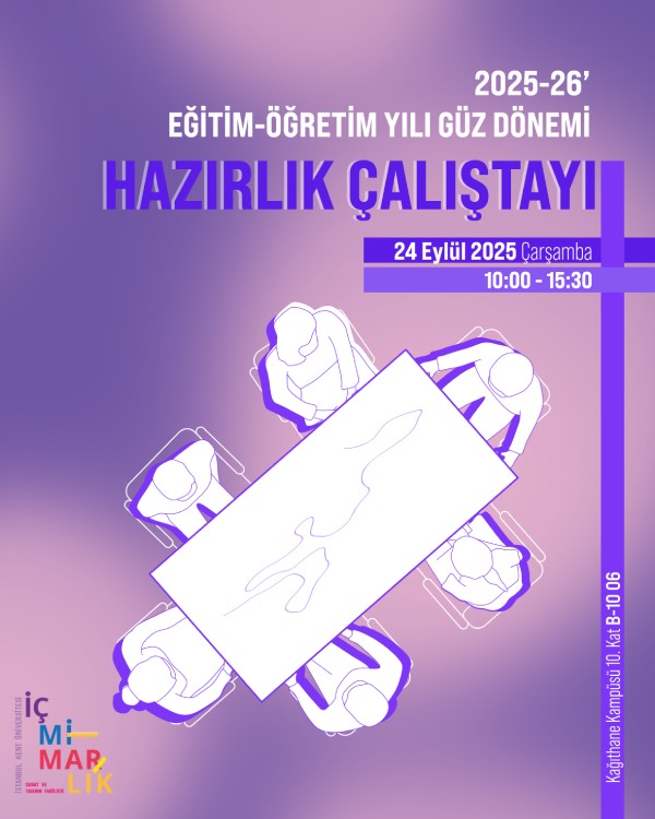 24 Eylül Çarşamba günü, İç Mimarlık Bölümü olarak 2025-26 Güz Yarıyılı Eğitim-Öğretim Hazırlık Çalıştayı İstanbul Kent Üniversitesi Kağıthane Kampüsü 10 kat B10 06 numaralı atölyede düzenlenecektir.