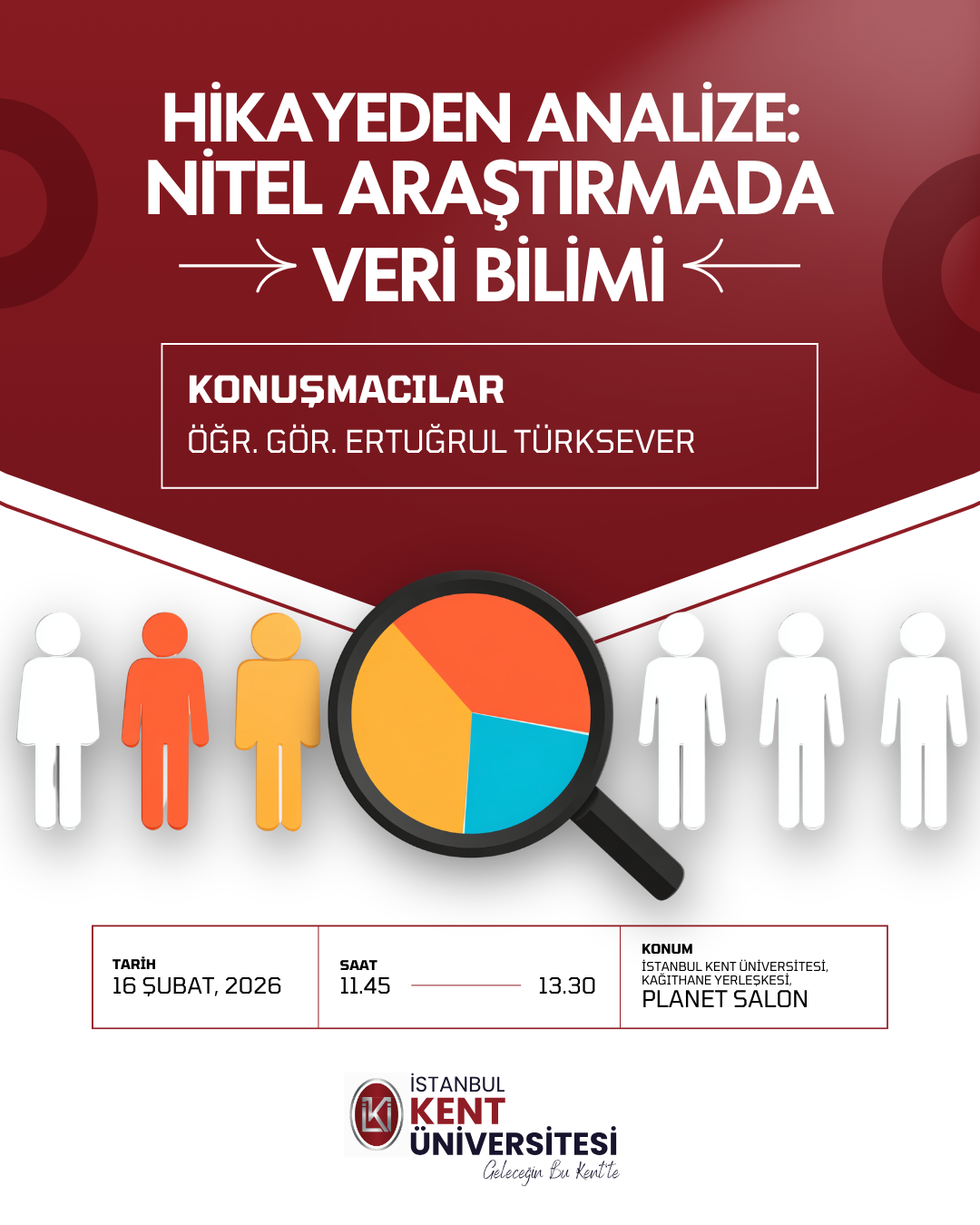 İstanbul Kent Üniversitesi Sağlık Bilimleri Fakültesi tarafından düzenlenen " Hikayeden Analize: Nitel Araştırmada Veri Bilimi" 16 Şubat saat: 11:45'de Kağıthane Kampüsü Planet Konferans Salonun da gerçekleştirilecektir.
