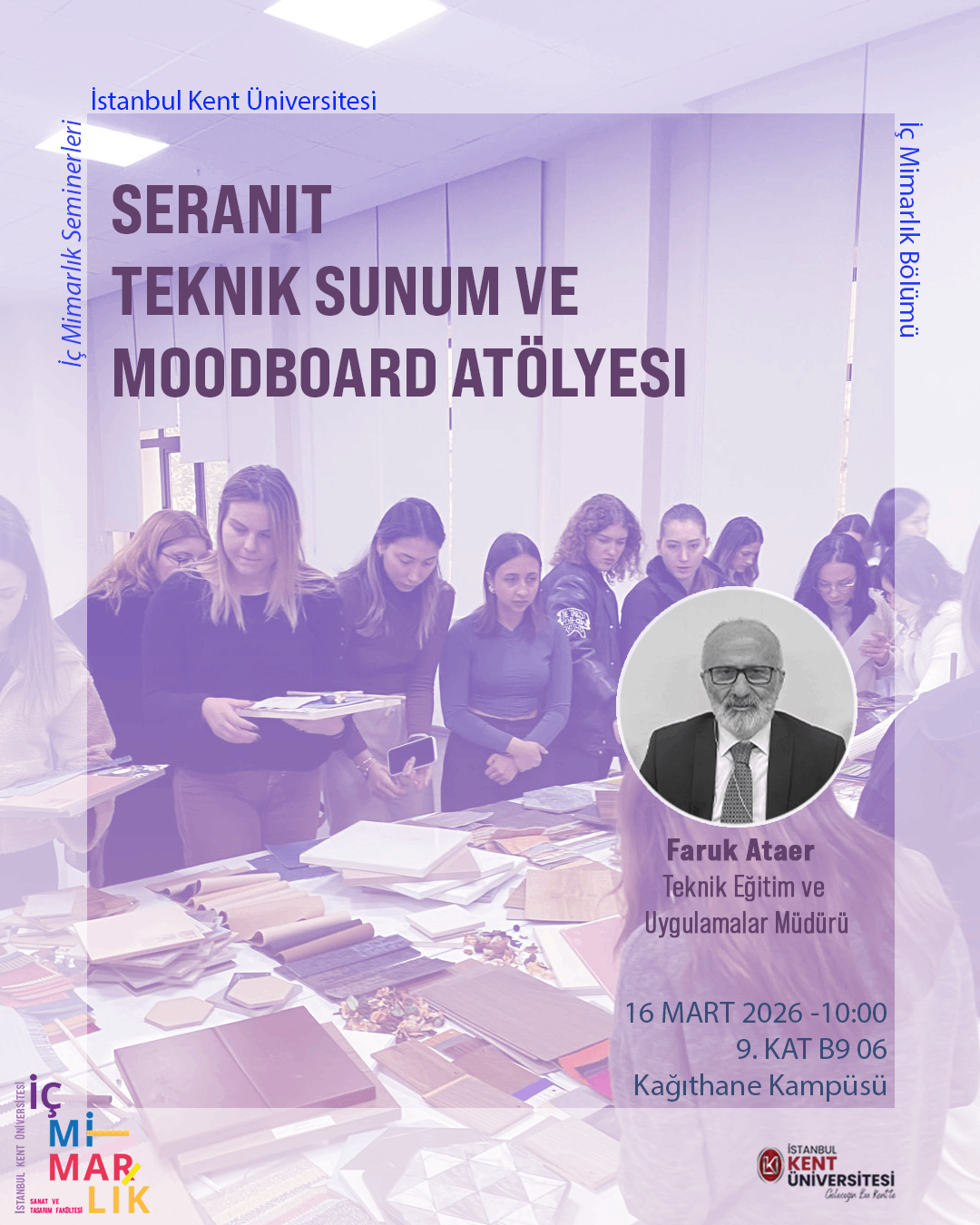 İç Mimarlık Bölümü Seminerleri kapsamında, Seranit Teknik Sunum ve Moodboard Atölyesi 16 Mart Pazartesi günü düzenlenecektir. Seramik ve porselen malzemelerin kullanım alanları ve teknik detaylarını içeren sunumun ardından; renk, doku ve materyallerin deneyimleneceği uygulamalı bir moodboard atölyesi gerçekleştirilecektir. Malzeme bilgisini yaratıcı süreçlere dönüştüreceğimiz bu ilham verici etkinliğe tüm öğrencilerimizi bekliyoruz!