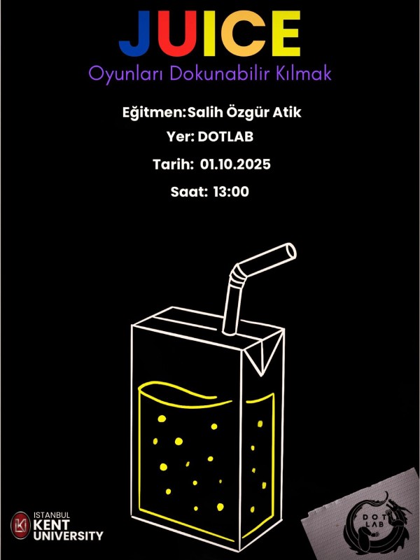 İstanbul Kent Üniversitesi Sanat ve Tasarım Fakültesi Dijital Oyun Tasarımı bölümü tarafından düzenlenen " JUICE Oyunları Dokunabilir Kılmak” konulu etkinlik 1 Ekim saat: 13:00’da Kağıthane Kampüsü Dotlab Salonu da gerçekleştirilecektir.