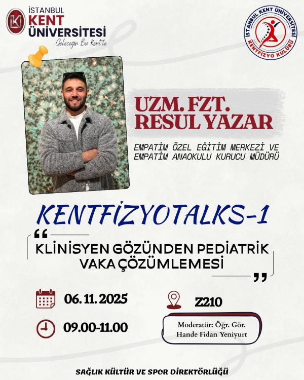 İstanbul Kent Üniversitesi Sağlık Bilimleri Fakültesi Fizyoterapi ve Rehabilitasyon Bölümü ve Kentfizyo Kulübü tarafından düzenlenen Klinisyen Gözünden Pediatrik Vaka Çözümlemesi " konulu etkinlik 6 Kasım saat: 09:00’da Kağıthane Kampüsü Z210 nolu salonda gerçekleştirilecektir.
