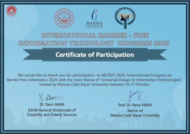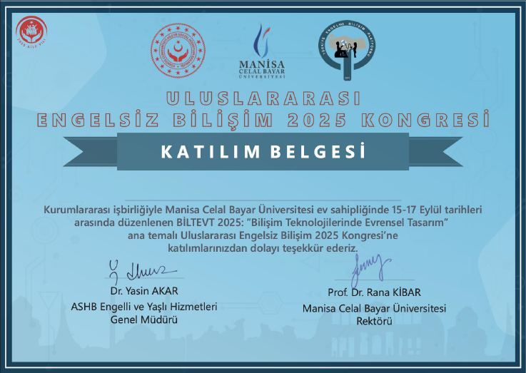 15–17 Ekim 2025 tarihleri arasında Türkiye Engelsiz Bilişim Platformu organizasyonuyla, Aile ve Sosyal Hizmetler Bakanlığı ve Manisa Celal Bayar Üniversitesi iş birliğinde Manisa’da gerçekleştirilen *“Uluslararası Engelsiz Bilişim 2025 Kongresi”*ne Prof. Dr. Köksal çevrim içi olarak katılım sağladı.