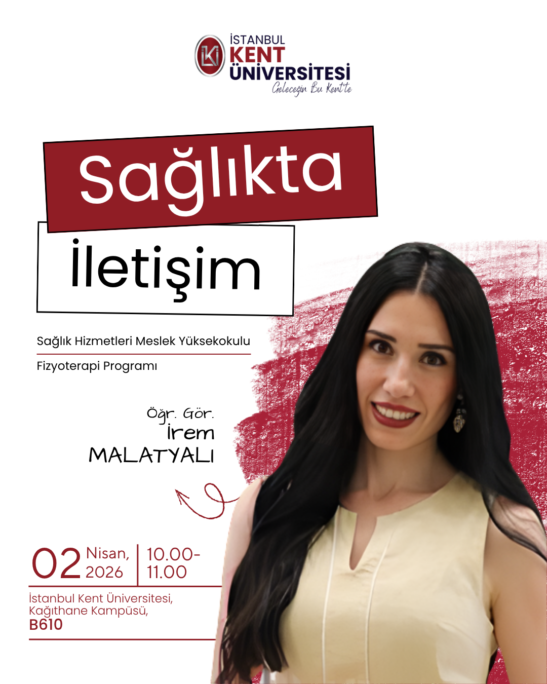 İstanbul Kent Üniversitesi Sağlık Hizmetleri Meslek Yüksekokulu Fizyoterapi Programı tarafından düzenlenen " Sağlıkta İletişim" konulu etkinlik 2 Nisan saat: 10:00'da Kağıthane Kampüsü B610 nolu derslikte gerçekleştirilecektir.