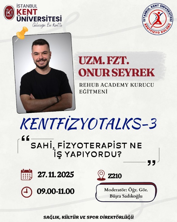 27.11.2025 tarihinde Fizyotalks-3 kapsamında Uzm. Fzt. Onur SEYREK’in katılımlarıyla ‘Sahi, Fizyoterapist Ne İş Yapıyordu?’’ isimli etkinlik Z210 Öğr. Gör. Büşra SADIKOĞLU moderatörlüğünde gerçekleşmiştir.