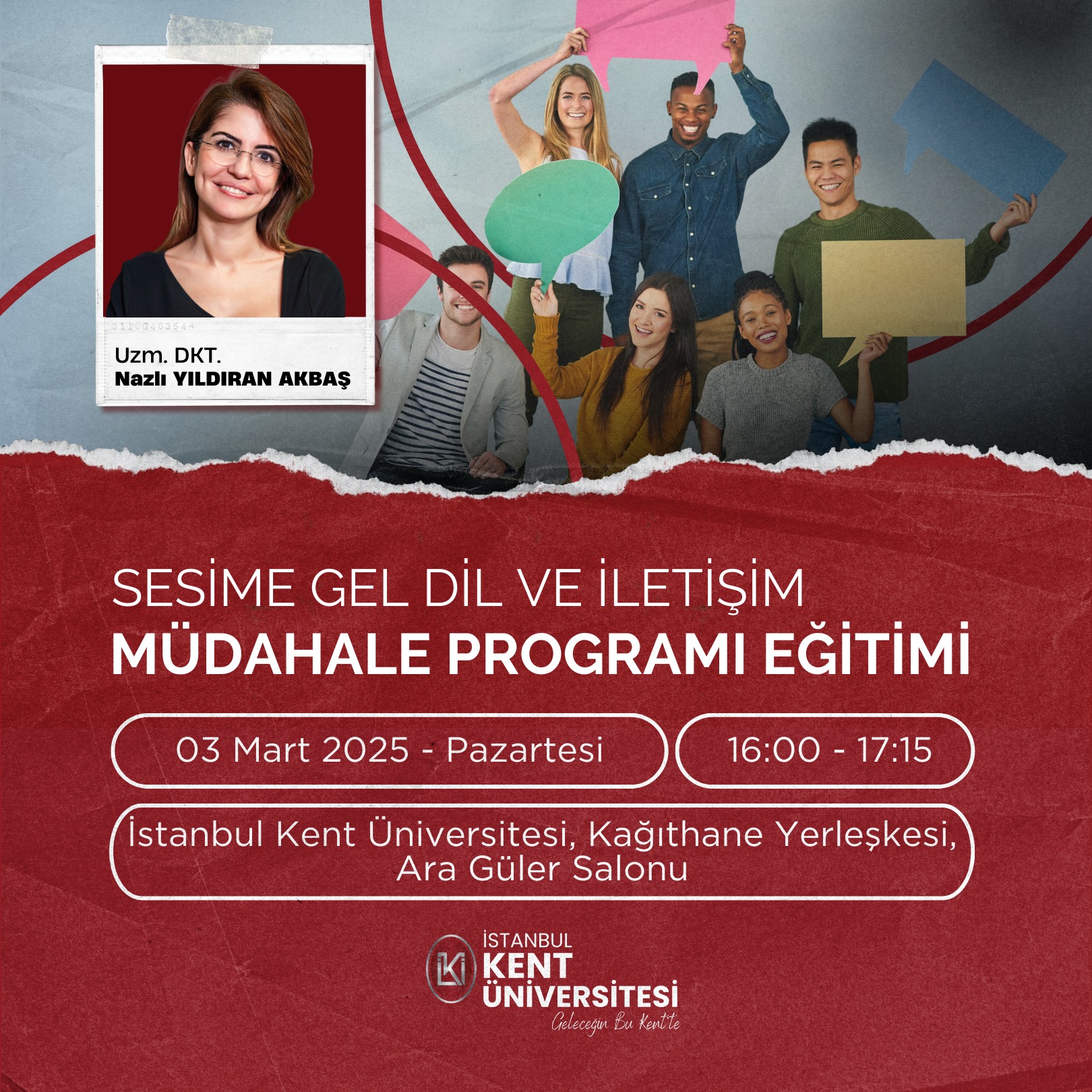 İstanbul Kent Üniversitesi Sağlık Bilimleri Fakültesi Dil ve Konuşma Terapisi Bölümü tarafından düzenlenen “ Sesime Gel Dil ve İletişim Müdahale Programı Eğitimi ” konulu etkinlik 3 Mart Pazartesi günü saat 16:00’da Kağıthane Kampüsü Ara Güler Konferans Salonumuzda gerçekleştirilecektir.
