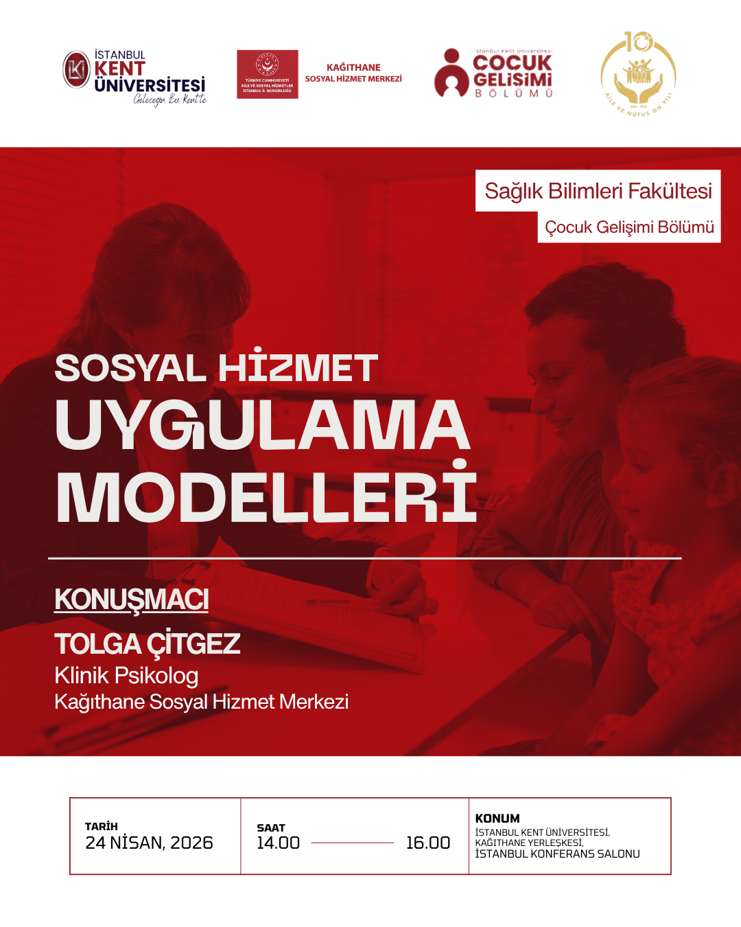 İstanbul Kent Üniversitesi Sağlık Bilimleri Fakültesi Çocuk Geşimi Bölümü tarafından düzenlenen "Sosyal Hizmet Uygulama Modelleri" konulu etkinlik 24 Nisan saat: 14:00'da Kağıthane Kampüsü İstanbul Konferans Salonunda gerçekleştirilecektir.