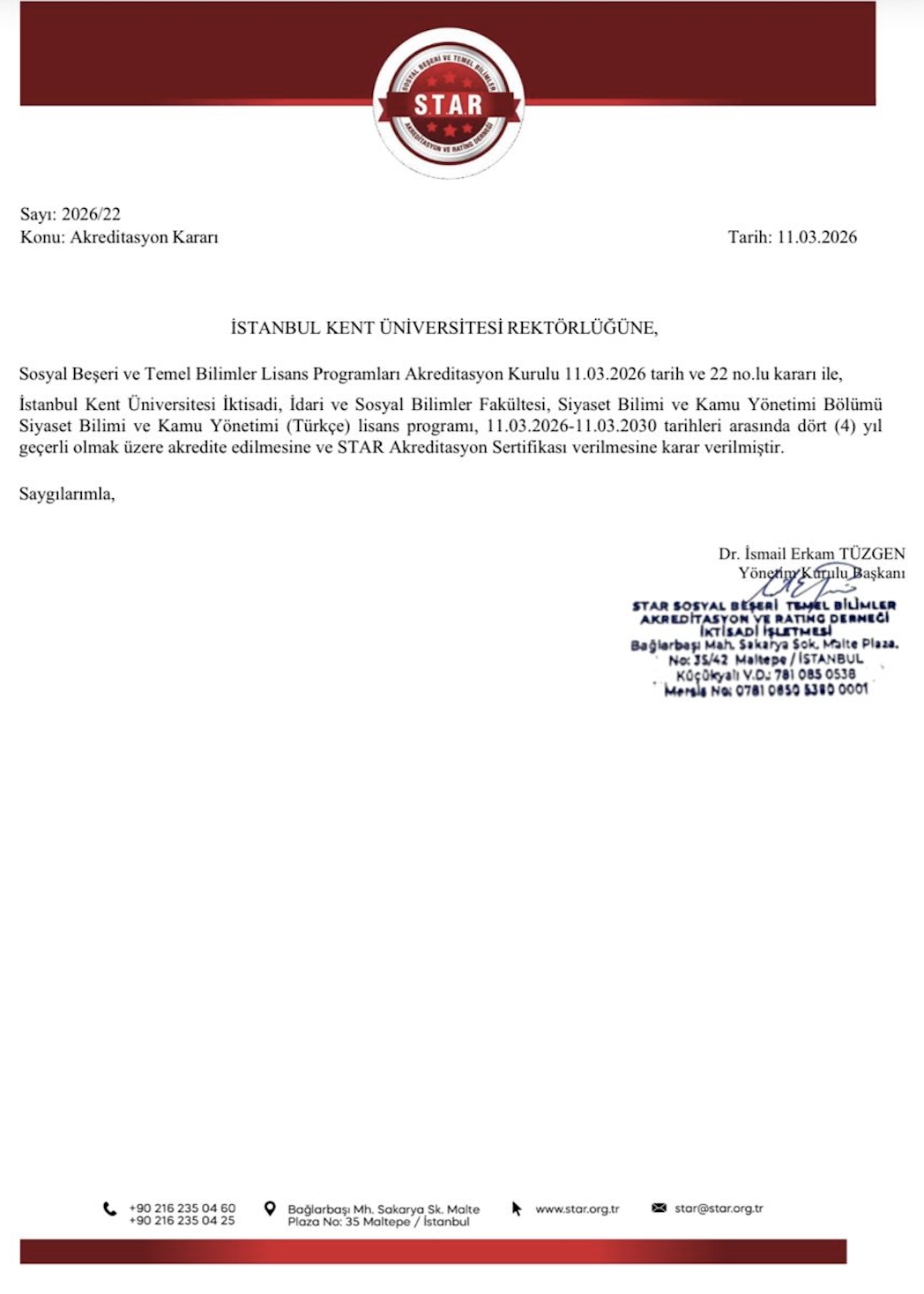 Aynı zamanda, Siyaset Bilimi ve Kamu Yönetimi (Türkçe) Lisans Programı da 11.03.2026 – 11.03.2030 tarihleri arasında 4 yıl süreyle akreditasyon almaya hak kazanarak, üniversitenin akademik kalite vizyonunu güçlendiren bir diğer önemli gelişme olmuştur.