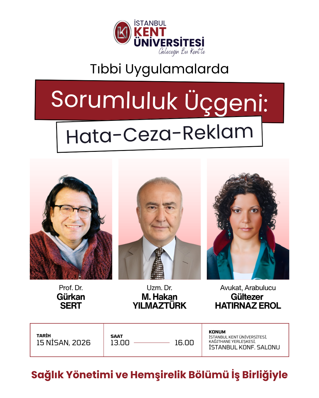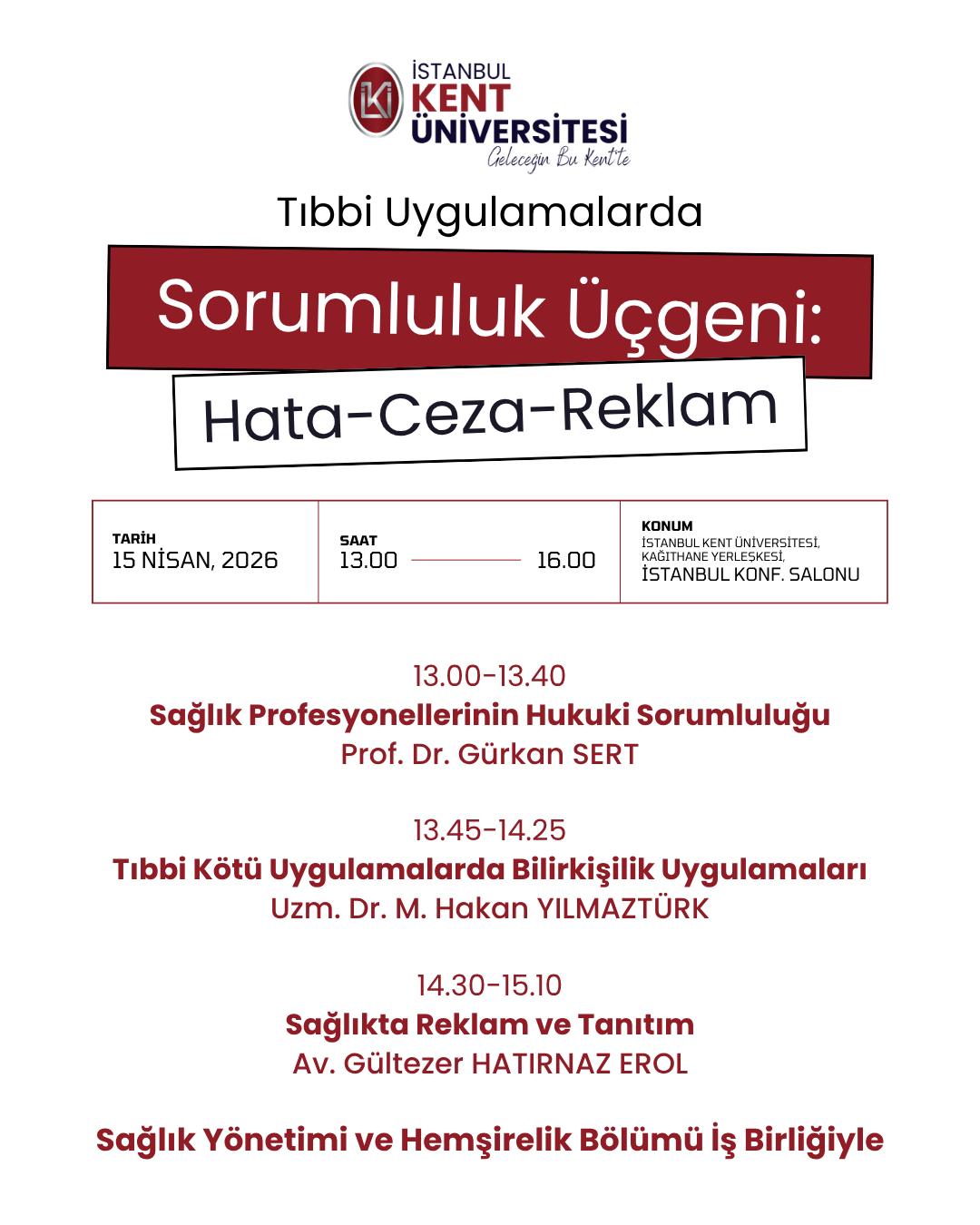 İstanbul Kent Üniversitesi Sağlık Bilimleri Fakültesi Hemşirelik ve Sağlık Yönetimi Bölümleri tarafından düzenlenen "Tıbbi Uygulamalarda Sorumluluk Üçgeni: Hata-Ceza-Reklam" konulu etkinlik 15 Nisan saat: 13:00'da Kağıthane Kampüsü İstanbul Konferans Salonun da gerçekleştirilecektir.