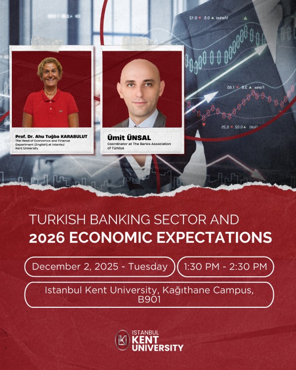 İstanbul Kent Üniversitesi İktisadi, İdari ve Sosyal Bilimler Fakültesi Ekonomi ve Finans Bölümü tarafından düzenlenen " Turkish Banking Sector And 2026 Economic Expectations " konulu etkinlik 2 Aralık saat: 13:00’da Kağıthane Kampüsü B901 nolu salonun da gerçekleştirilecektir.