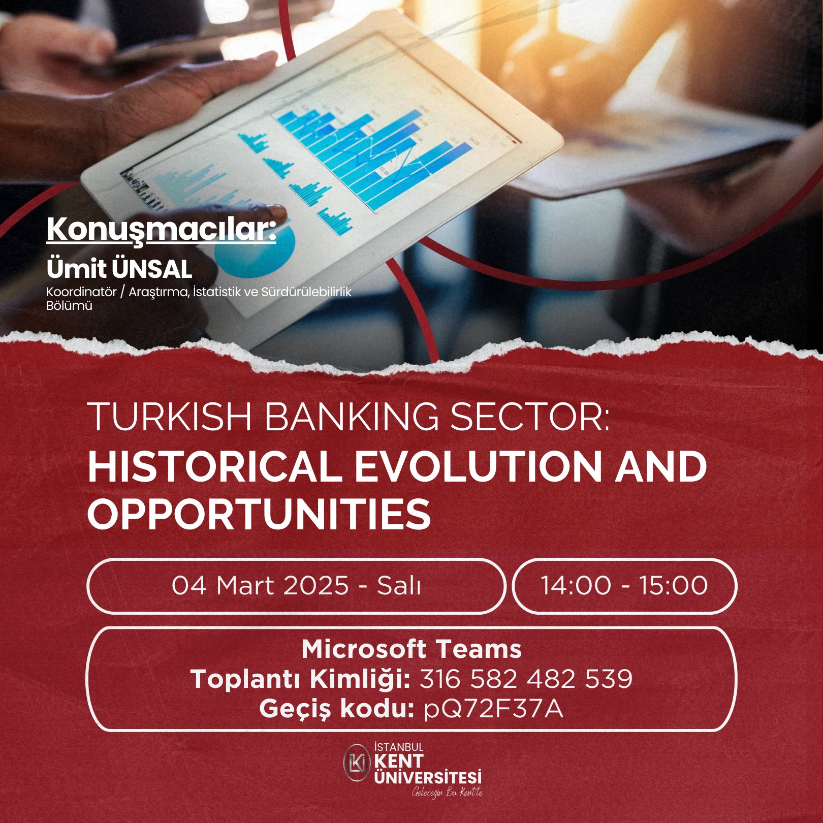 İstanbul Kent Üniversitesi İktisadi, İdari ve Sosyal Bilimler Fakültesi Ekonomi ve Finans Bölümü tarafından düzenlenen " Turkish Banking Sector And 2026 Economic Expectations " konulu etkinlik 2 Aralık saat: 13:00’da Kağıthane Kampüsü B501 nolu salonun da gerçekleştirilecektir.