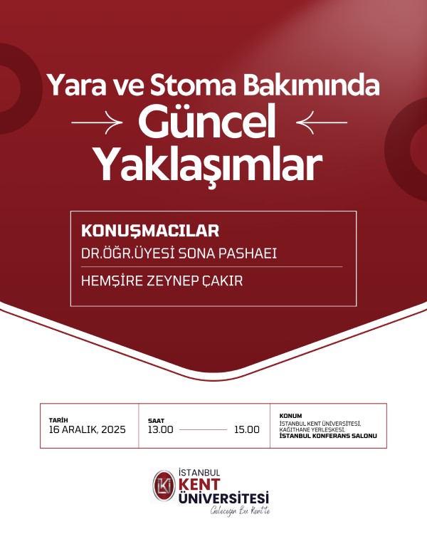 İstanbul Kent Üniversitesi Sağlık Bilimleri Fakültesi Hemşirelik Bölümü tarafından düzenlenen ''Yara ve Stoma Bakımında Güncel Yaklaşımlar'' konulu etkinlik, 16 Aralık günü saat 13.00'te Kağıthane Kampüsümüzün İstanbul Konferans Salonu'nda gerçekleştirilecektir.