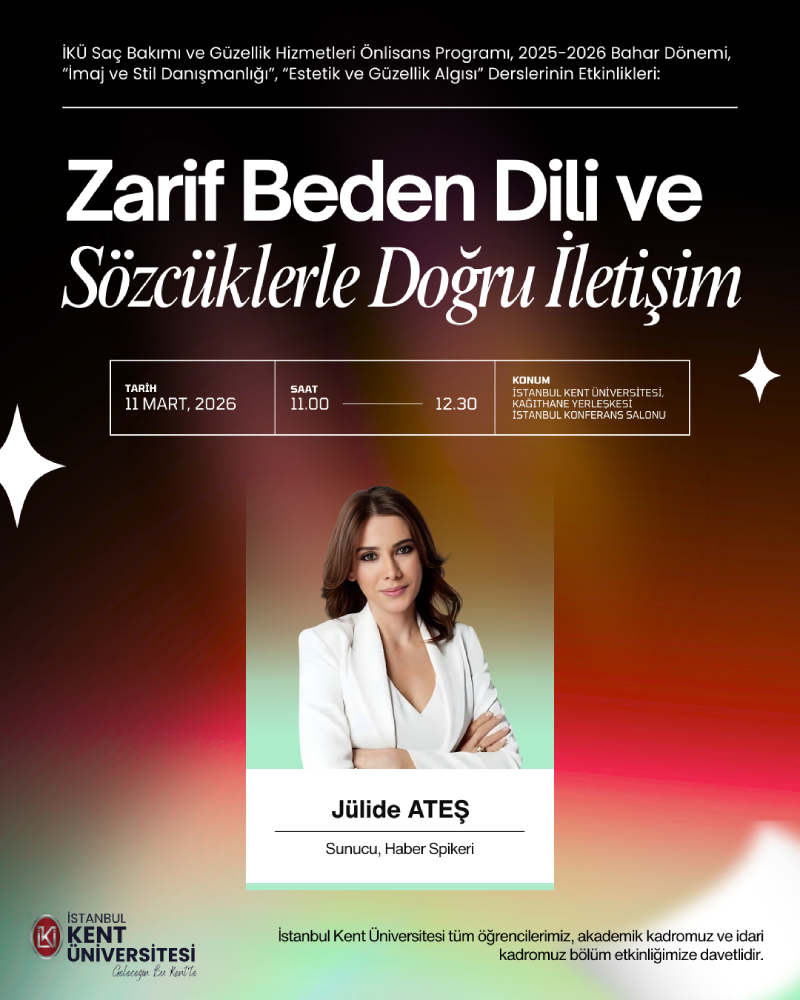 İstanbul Kent Üniversitesi Meslek Yüksekokulu Saç Bakımı ve Güzellik Hizmetleri Programı İmaj ve Stil Danışmanlığı Estetik ve Güzellik Algısı dersleri kapsamında düzenlenen “ Zarif Beden Dili ve Sözcüklerle Doğru İletişim ” konulu etkinlik 11 Mart saat: 11:00’da Kağıthane Kampüsü Planet Konferans Salonun da gerçekleştirilecektir.
